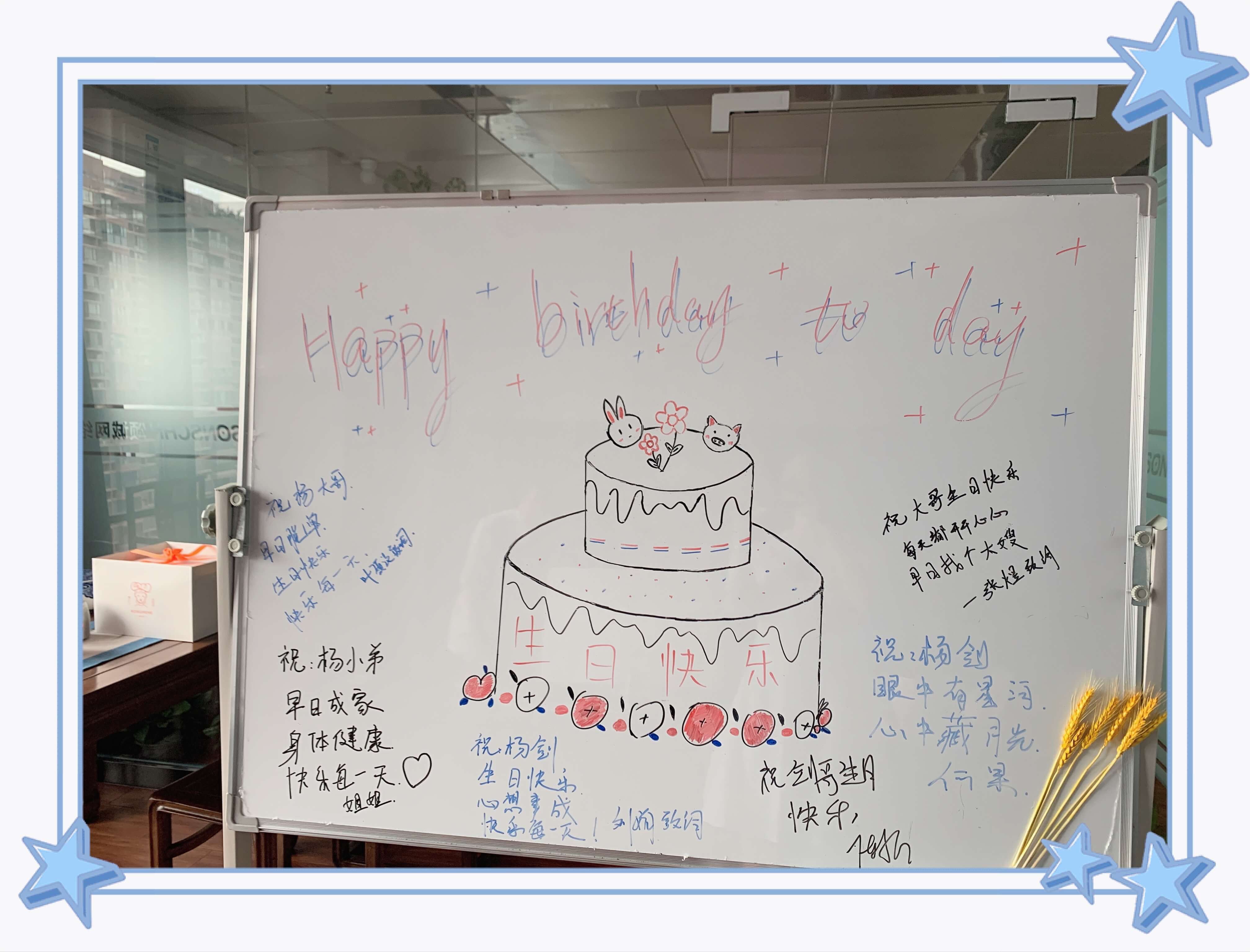 生日會上,何總首先對各位參加生日會的員工在工作中所付出的辛勞、努力和汗水表示感謝。同時(shí),他代表所有領(lǐng)導(dǎo)及全體員工為壽星送上了美好的祝福。何總表示“員工為本”是頌誠網(wǎng)絡(luò)一直以來所倡導(dǎo)的企業(yè)文化,日后公司將根據(jù)員工生日的時(shí)間舉辦形式多樣的生日活動(dòng),讓大家即使在頌誠網(wǎng)絡(luò)工作,也同樣能感受到公司給予的關(guān)懷?;顒?dòng)期間,大家一起在白板上作畫寫字,留下對壽星的祝福話語;一起唱生日快樂歌,沉浸在這快樂的氛圍中。